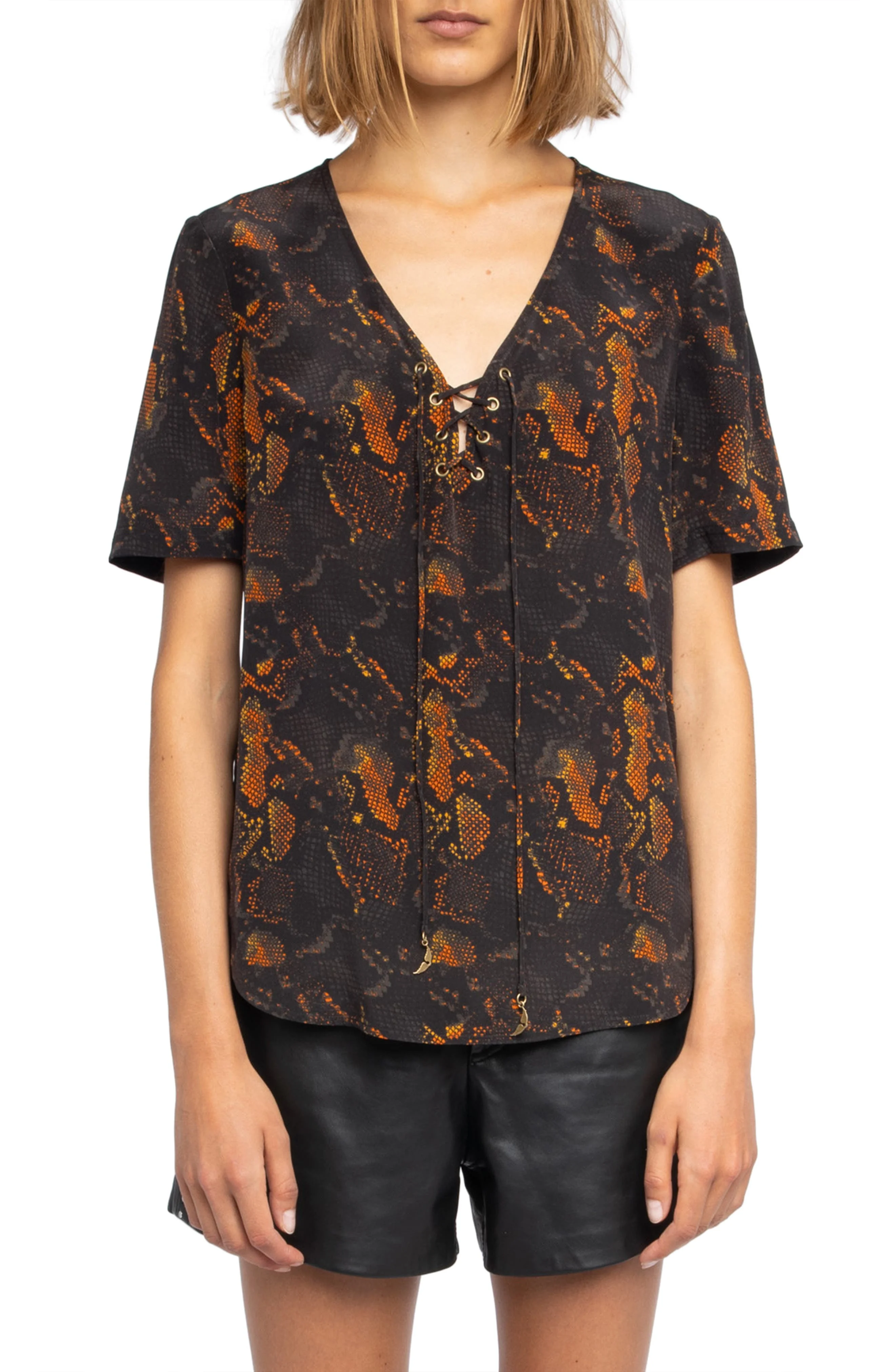 This short-sleeve top of supple silk in a bold python print features a lace-up neckline that makes a retro-chic statement. Front tie closure V-neck Short sleeves 100% silk Machine wash, dry flat Imported