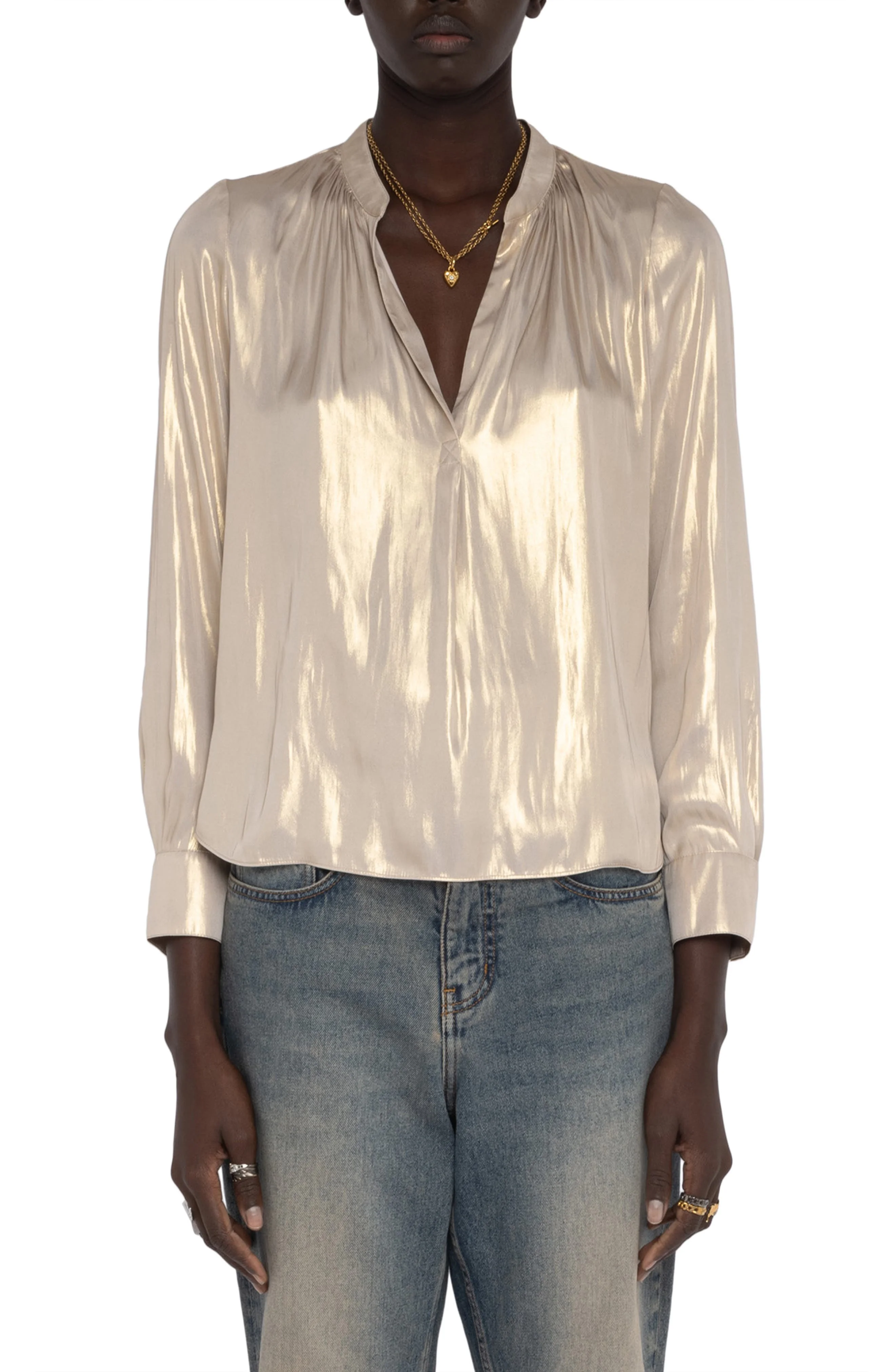 Soft, crinkled satin catches the light with a warm, golden glow in this free-flowing popover top, where gentle gathers radiate across the shoulders. Split neck Long sleeves with one-button cuffs Curved hem 100% polyester Machine wash, dry flat Imported