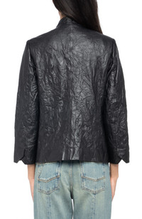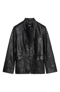 A crinkled effect doubles down on the rugged swagger of an essential leather jacket popped with a stand collar and blazer-inspired pocketing. Open front Stand collar Chest welt pocket; front flap pockets Lined Leather Professional leather clean Imported