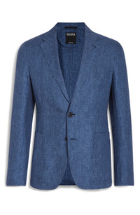 This soft, unstructured jacket is tailored from a rich mélange suiting fabric woven from linen and left unlined for comfort in warmer weather. Notched lapels Three-button cuffs Chest welt pocket; front patch pockets Unlined 100% linen Dry clean Made in Switzerland Designer Clothing