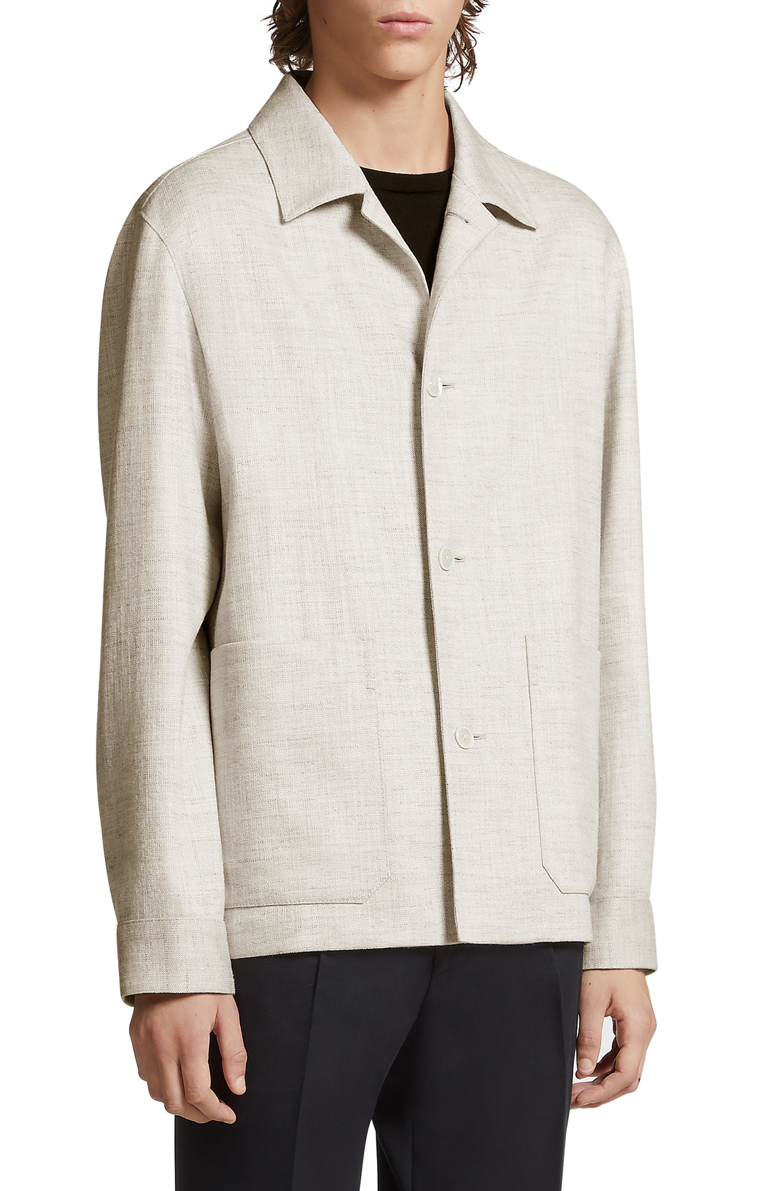 ZEGNA takes a clean-lined, minimalist approach to utility style on this chore jacket crafted of a wool-enriched silk-and-linen blend kissed with stretch. Front button closure Spread collar Long sleeves with button cuffs Front patch pockets Unlined 35% silk, 35% linen, 19% wool, 10% polyamide, 1% elastane Dry clean Made in Italy Men's Designer Clothing