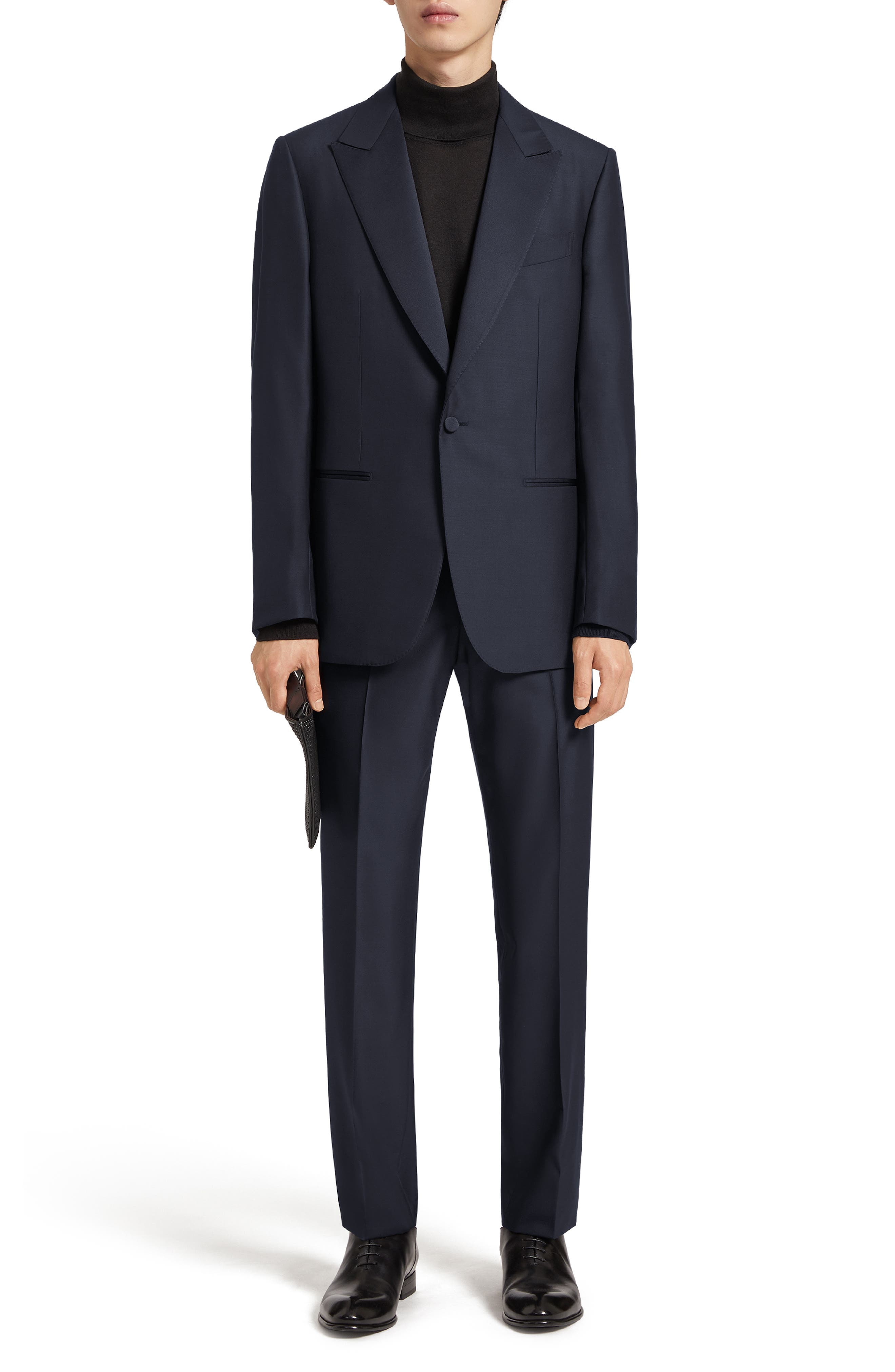 A sumptuous choice for formal wear, this classically styled navy tuxedo is impeccably tailored in Italy from a blend of superfine wool and lustrous silk. Jacket has one-button closure; peaked lapels; chest pocket; welt pockets Trousers have zip fly with hook-and-bar closure Jacket is lined; trousers are lined to the knee 85% wool, 15% silk Dry clean Made in Italy Men's Designer Clothing