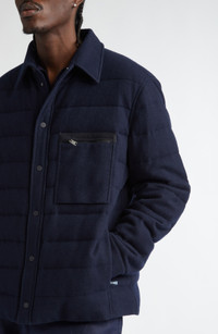 ZEGNA's refined materials meet rugged style on this channel-quilted shirt-jacket crafted of a sumptuous cashmere knit with calfskin-leather accents. Front snap closure Point collar Snap cuffs Chest zip pocket; side-seam pockets Durable water-repellent (DWR) finish Lined, with 90% down, 10% feather fill 100% cashmere Dry clean Made in Italy Designer Clothing