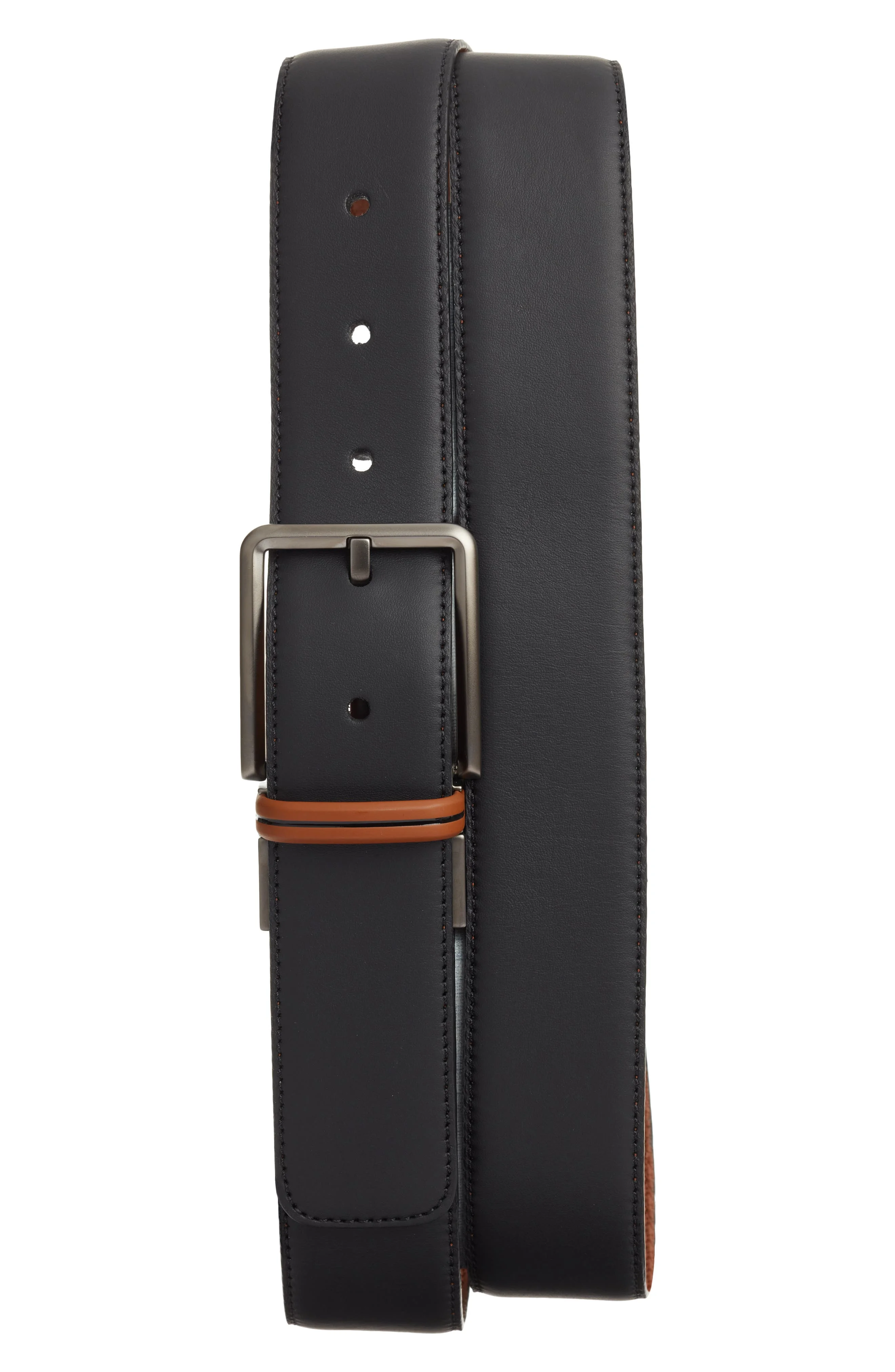 With one side in smooth black leather and the other vicuna-colored grained deerskin, this reversible belt offers a variety of styling options. Leather Made in Italy