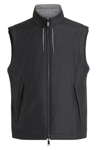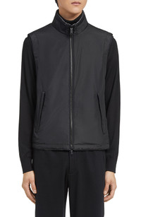 A reversible design doubles the styling potential of a lightweight vest detailed with a two-way zipper and smart stand collar. Two-way front-zip closure Stand collar with drawstring Front zip pockets 100% polyester Dry clean Made in Romania Designer Clothing