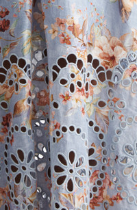 Airy eyelet embroidery adorns the skirt of this floral linen sundress outlined with loopy picot trim at the neck and tethered with slim charm-tipped ties at the shoulders. Hidden back-zip closure Scoop neck Adjustable tie straps Side-seam pockets Smocked back panel Linen bodice lining; cotton skirt lining 100% linen Dry clean Imported Designer Clothing
