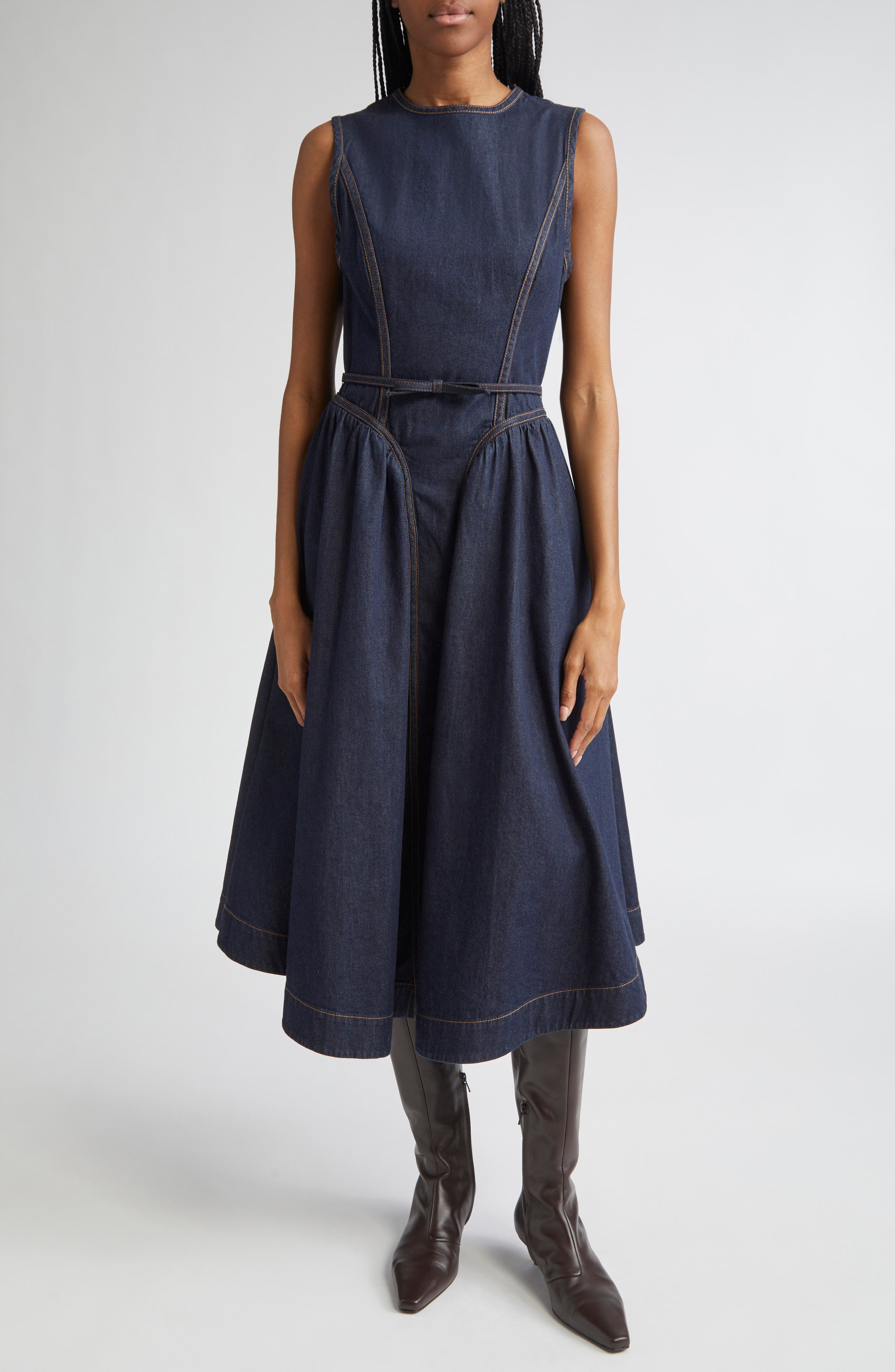 Nicky Zimmermann brings her focus on chic silhouettes and playful designs to this belted midi dress crafted from dark-wash denim with shapely seams and contrast topstitching. Exposed back-zip closure Crewneck Sleeveless Side-seam pockets Removable skinny belt Lined 100% cotton Dry clean Imported Designer Clothing