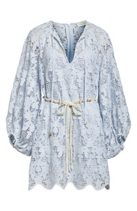 Airy guipure lace, billowy sleeves and scalloped edging channel retro romance for this tunic dress from the Aussie label's continued celebration of '70s surf culture. A beaded rope belt enhances the boho-eclectic look. Hidden back-zip closure Split neck with ties Long sleeves with elastic cuffs Removable tie belt Slip lining 100% polyester Dry clean Imported Designer Clothing