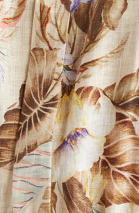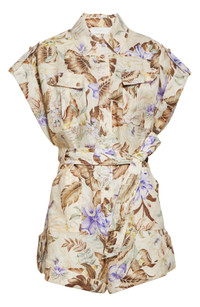A tropical print and carved wood buttons bring a boho beat to this utility-inspired linen romper from the Aussie label's summer '25 collection that celebrates '70s surf culture. Button half placket Spread collar Short sleeves Chest button-flap patch pockets; front patch pockets Removable belt 100% linen Dry clean Imported Designer Clothing