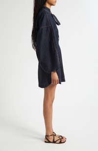 Voluminous dolman sleeves bring distinctive style to this lightweight denim minidress designed with structured front ties and a high collar. Back zip closure; snap half placket Stand collar with snap Long sleeves with elastic cuffs Side-seam pockets 100% cotton Dry clean Imported Designer Clothing