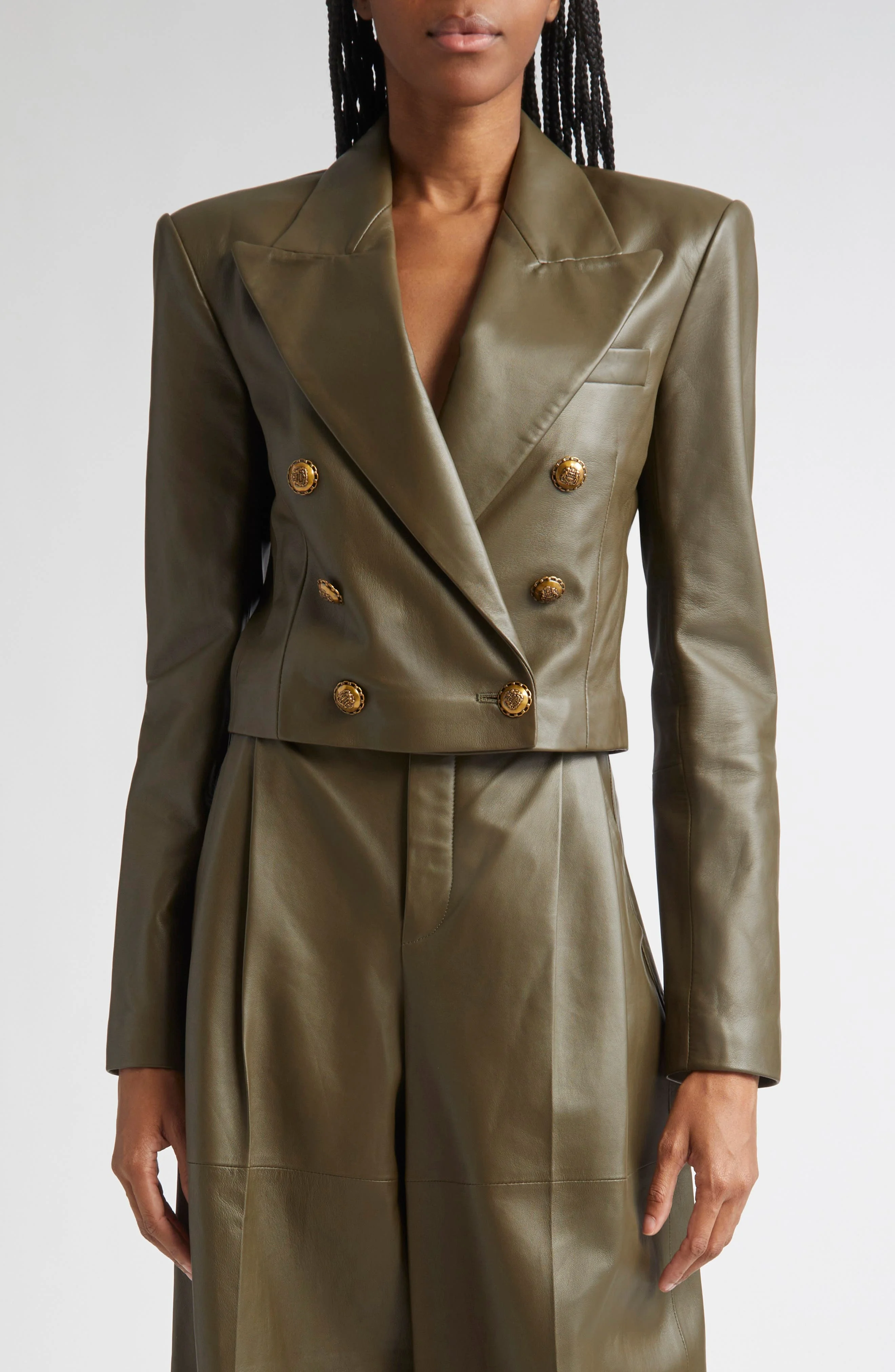 Vintage-inspired buttons bring retro allure to this straight-from-the-runway blazer tailored in a double-breasted cropped silhouette from supple sheepskin leather. The look is part of the Aussie label's Hypnotic collection, a nostalgic outing inspired by the 1970s Australian film 'Picnic at Hanging Rock.' Double-breasted button closure Peaked lapels Four-button cuffs Chest welt pocket Lined Leather Professional leather clean Made in Turkey Designer Clothing
