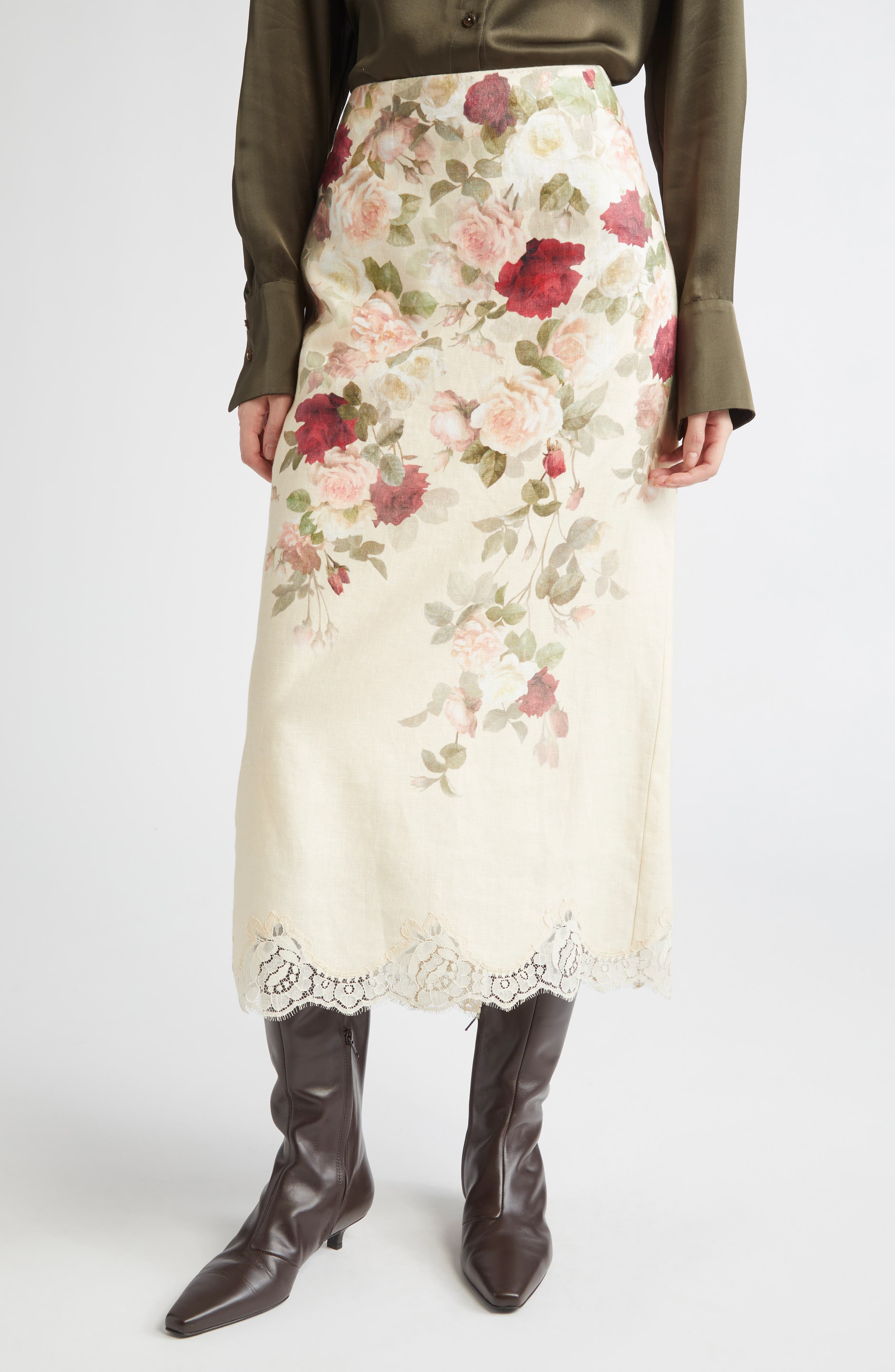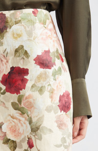 Softly shaded roses accentuate the retro/romantic character of this lightweight linen pencil skirt from the Aussie brand's fall '25 collection, Hypnotic. This nostalgic outing is inspired by the 1970s Australian film 'Picnic at Hanging Rock,' capturing the film's mysterious and ethereal spirit through the incorporation of storytelling elements such as lace and the colors of Australian nature. Hidden back-zip closure Back slit Cotton lining 100% linen Dry clean Imported Designer Clothing