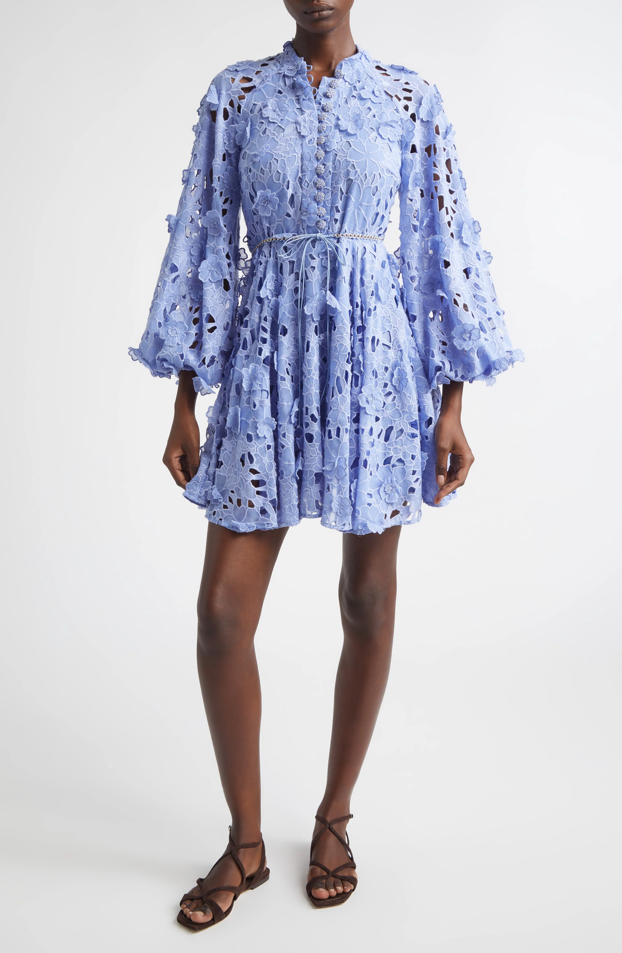 Gauzy embroidered eyelet and appliques bring dimensional texture to this airy dress cinched at the waist with an interlaced chain tie and fastened at the placket with romantic gilt flower buttons. Hidden back-zip closure; front button-and-loop placket Band collar Long sleeves with elastic cuffs Removable waist tie Cotton slip lining 100% cotton Dry clean Imported Designer Clothing
