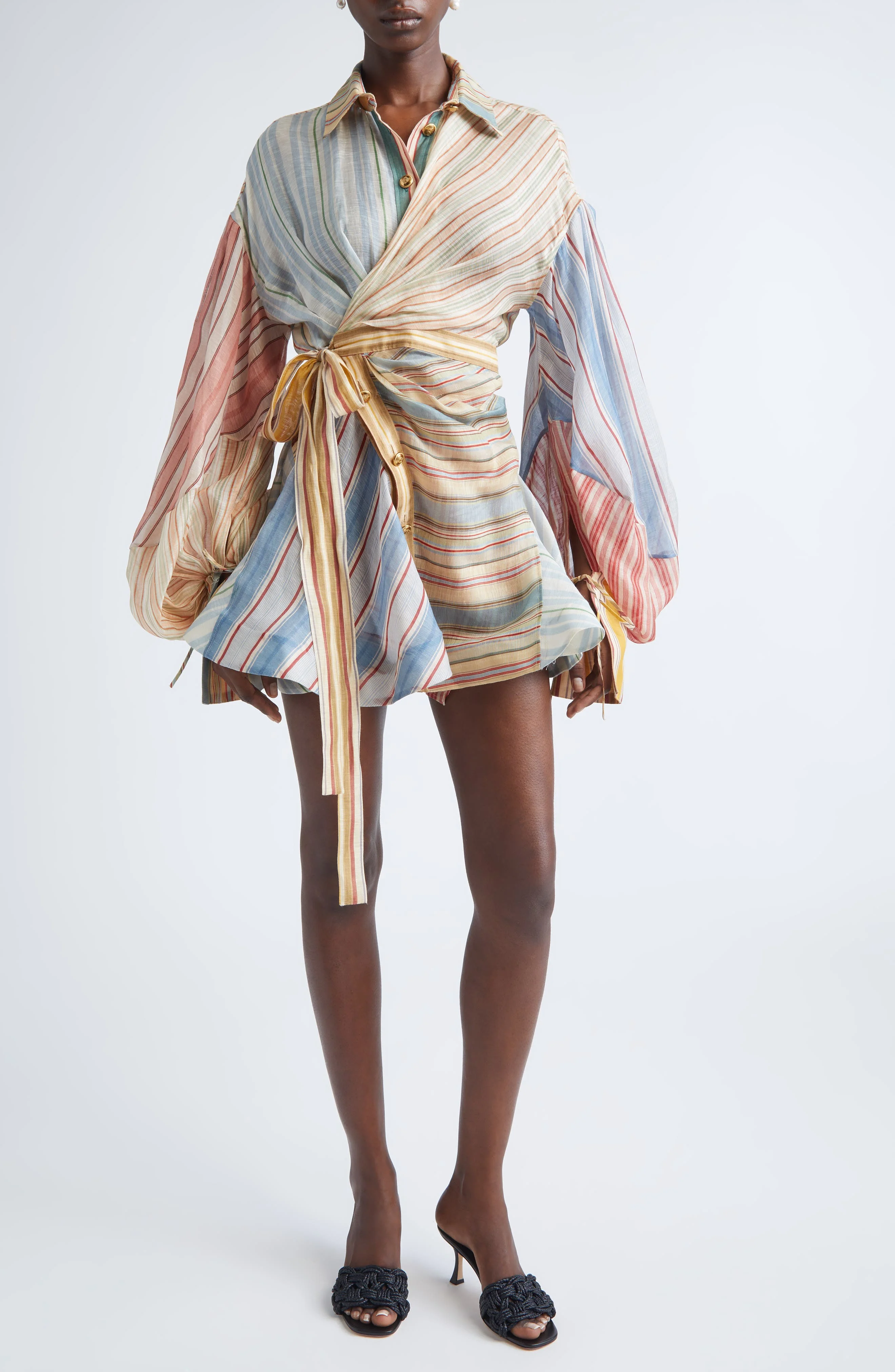 Zimmermann Rebellion Asymmetric Stripe Long Sleeve Linen & Silk Shirtdress in Spliced Stripes at Nor