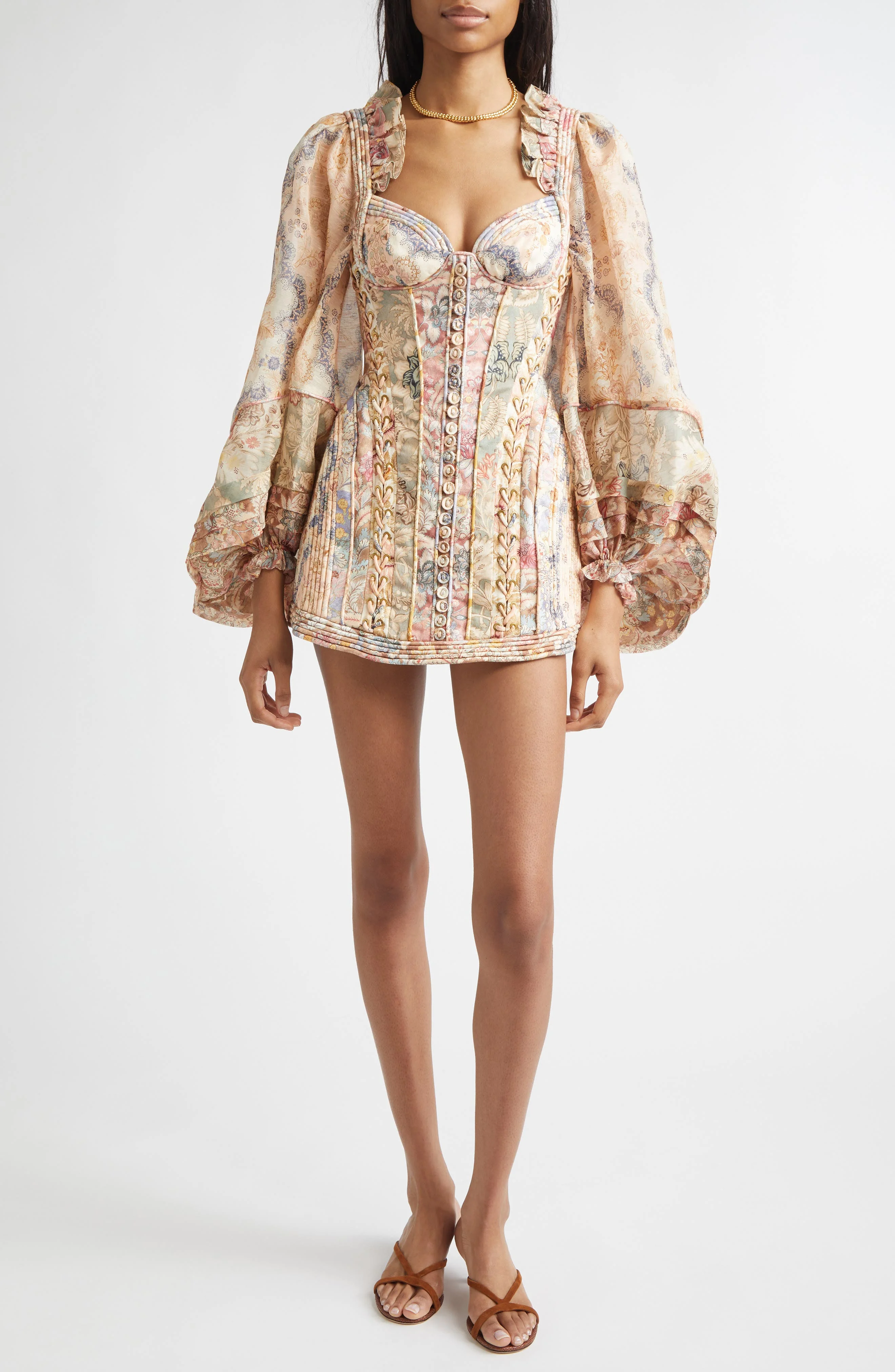 Steeped in the nautical escapism of the 'Twisted Romance' collection, this floral-print minidress evokes a romantic world of roguish pirates and intrepid heroines. Voluminous sleeves with ruffled trim frame the sweetheart neck and corset-inspired bodice with corded piping and laced details. Hidden back-zip closure Sweetheart neck Long sleeves with elastic cuffs Lined 100% linen with 55% linen, 45% silk contrast Dry clean Imported Designer Clothing