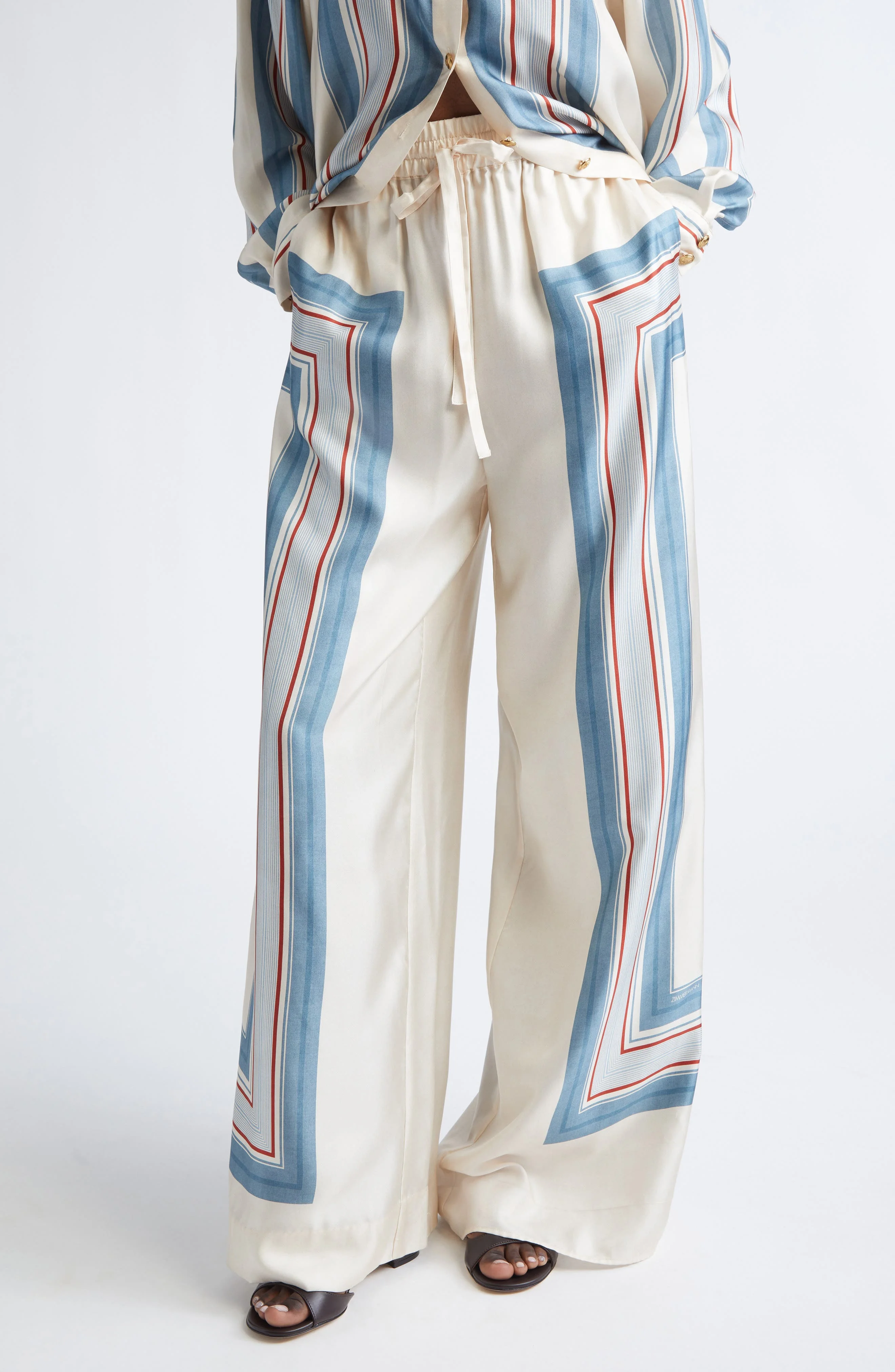 From the label's Cruise '26 collection, these silk pants turn warm weather into an invitation to wander, casting a fluid silhouette while geometric stripes play artist across the surface for a boho-eclectic kick. Elastic/drawstring waist Side-seam pockets 100% silk Dry clean Imported Designer Clothing