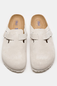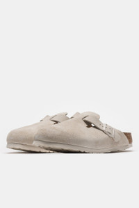 Birkenstock unisex standard fit “Antique” white premium suede mule. Features 2.8 to 3.2 mm leather, adjustable metal pin buckles, an additional soft foam layer on the anatomically shaped cork footbed which offers extra support and all-day comfort, and an EVA outsole. Fit - Narrow width - European unisex sizing Feature - Slip-on front with adjustable buckles - Premium suede upper - Rounded toe - Anatomically shaped cork footbed - Tonal suede lining - EVA sole unit Fabrication - Style # 1027693 - Made in Germany SKU: 1027693-36