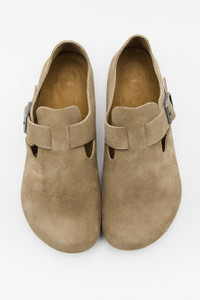 Birkenstock unisex standard fit “Taupe” premium suede clog. Features 2.8 to 3.2 mm leather, an adjustable metal pin buckle, a suede lined cork footbed with integrated latex foam cushion for added comfort, and an EVA outsole. Fit - Regular width - European unisex sizing Feature - Slip-on front with adjustable buckle - Premium leather upper - Rounded toe - Anatomically shaped cork footbed - Integrated latex foam cushioning - Tonal suede lining - EVA sole unit Fabrication - Style # 1010503 - Made in Germany SKU: 1010503-42