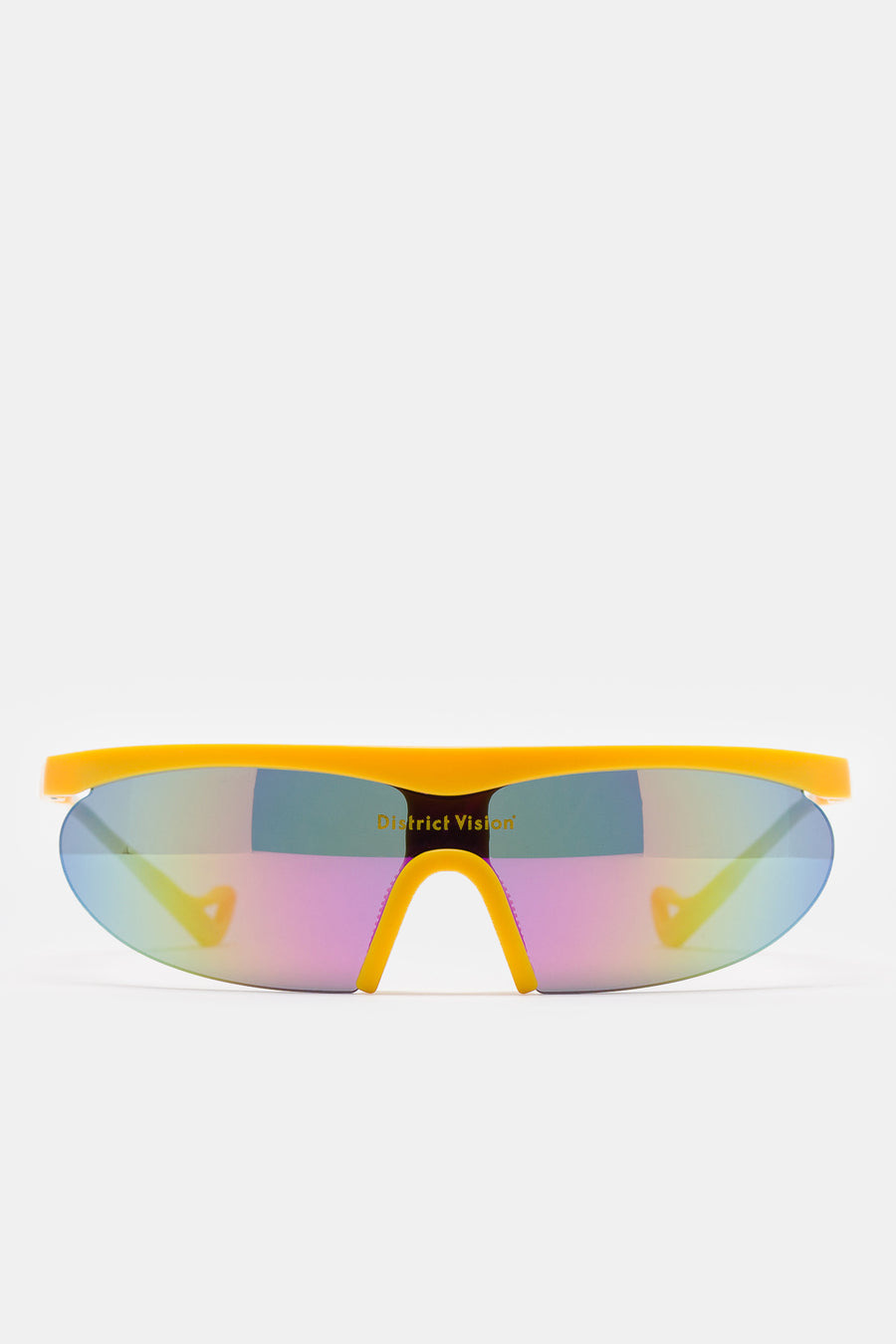 District Vision sunglasses in "Yuzu" yellow and "Aqua" mirror lens. Feature mirrored lenses, a printed logotype, and wrap around style frame. Feature - TR90 nylon injected frame - Logotype printed on lens - Beta titanium armature and hardware - D+ therauputc lenses Fabrication - Handmade in Japan SKU: DVG005-YUZU-OS