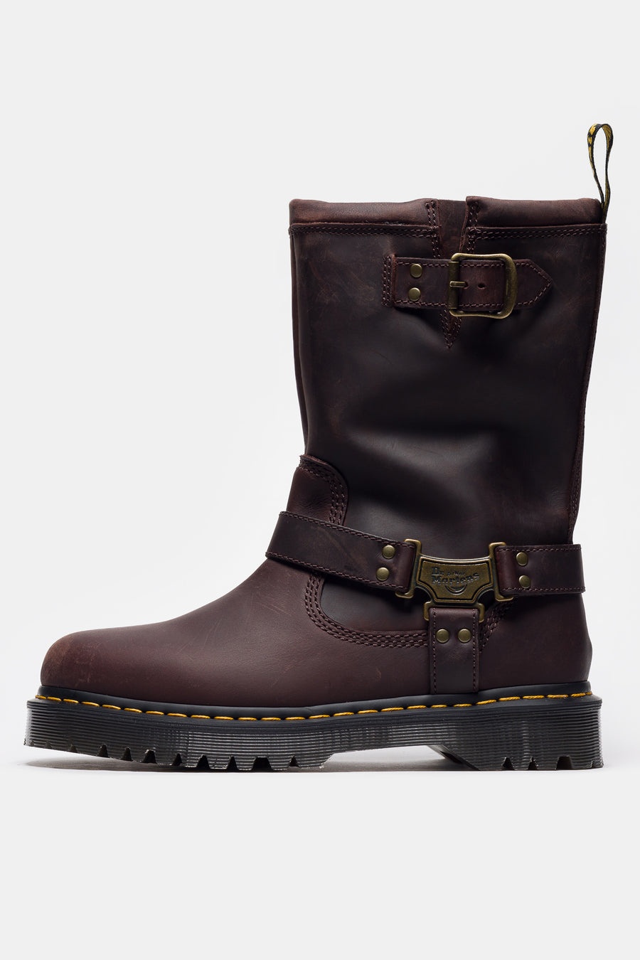 Dr. Martens Anistone Hi Leather Biker Boot in Brown. Features durable soft leather upper, round toe, harness, and pull tab on back. Fit - Standard fit - US men’s sizing Feature - Durable soft leather upper - Harness - Rugged BEN outsole - Goodyear Welt Fabrication - Style # 31901201 - Made in Vietnam SKU: 31901201-9