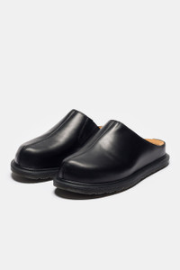 Dr. Martens unisex standard fit black leather mule. Features a waxed leather upper, front seam, and a Goodyear-welted Shore cushioned sole. Fit - Standard fit - US men’s sizing Feature - Slip-on front - Leather upper Fabrication - Style # 41615001 - Made in England SKU: 41615001-5