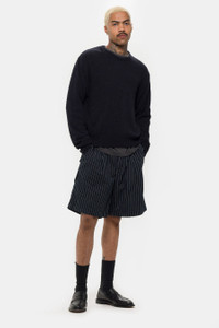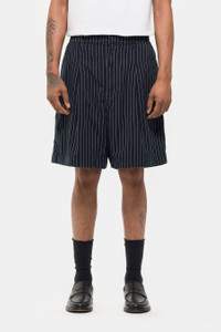 Entire Studios unisex shorts in black pinstripe. Features a black and white pinstripe, pleat detailing, and medium length. Fit - Unisex regular fit Feature - CF button closure - Slant pockets - White pinstripe - Medium length - Pleat detailing Fabrication - 100% cotton - Made in China SKU: ESU-S25-5007-NO-L