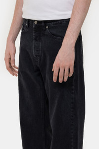 HOPE unisex relaxed fit black 100% certified organic cotton 5-pocket jeans. Features a wide leg, a high rise, and HOPE branded buttons and trims. Fit - Standard fit - US unisex’s sizing - Runs true to size for US men’s sizing - Runs one size large for US women’s sizing Feature - Wide leg - High Rise - HOPE branded buttons and trims - 5-pocket design - 100% certified organic cotton - Washed with an eco laundry company that recycles 97% of its water Fabrication - Material: 100% certified organic cotton SKU: 00279853-00760-26