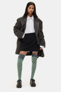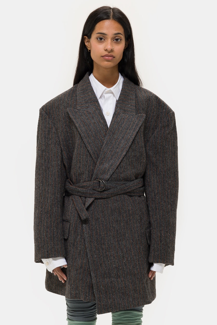 HOPE women's oversized fit herringbone striped blazer. Fit - Oversized fit - European women's sizing - We recommend your regular size for intended fit, - One size down for a more true to size fit - Model wears size 36 Feature - Oversized fit - Wide shoulder design - Wrap blazer closure - Double breasted - Peak lapel - Coroso buttons - Viscose lining - Orange stripe throughout design - Striped sleeve lining - Removable belt - 3 inside pockets Fabrication - 100% Wool SKU: 47117109-00763-40
