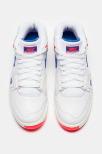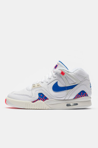 Nike men's leather Air Tech Challenge 2 sneaker in white, "Royal Blue", and "Laser Crimson". Featuring smooth leather, synthetic leather, and tough textiles. Hitting the '90s tennis scene on the feet of the hottest player at the time, the Air Tech Challenge turned heads on the court with its brash and unconventional style Feature - Embroidered Branding - Perforated Toe Box - Air Cushioning Fabrication - Smooth leather - Synthetic leather - Tough textiles - Style # FZ9033-102 SKU: FZ9033-102-6