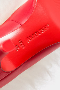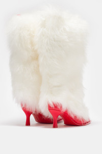 UGG x AMBUSH women's standard fit white and red fur boot. Features 2" heel, leather lace, and treaded fore foot. Fit - Standard width - US women's sizing Feature - 2" heel - Fur upper - Leather lined Fabrication - Style # 1178610-WHRD SKU: 1176810-WHRD-5