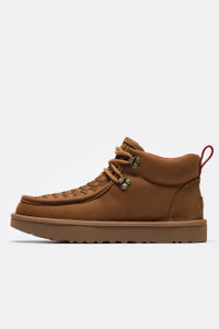 UGG x AMBUSH men's standard fit chestnut leather boot. Features back pull tab on the collar, woven leather vamp, lace closure, and sugarcane EVA outsole. Fit - Standard width - US men's sizing Feature - Woven leather vamp detail - Leather upper Fabrication - Style # 1178992-CHE SKU: 1178992-CHE-5
