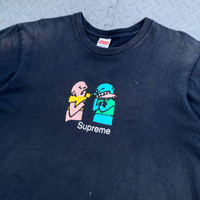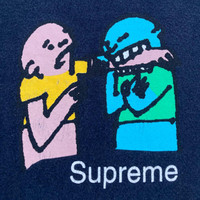 Supreme FW19 Bite Tee Brand: Supreme Year: 2019 Made in: USA Material: Cotton Color: Navy Size on tag: Medium Sizing: Measurements (flat, not stretched): Shoulders: 19.5” Sleeves: 8.5” Width: 21” Hem: 22.5” Length: 28” Color rating: 7.5/10 Condition overall: 7/10 Issues: multiple pinholes, discoloration DM here for more pics IG @archived_g_