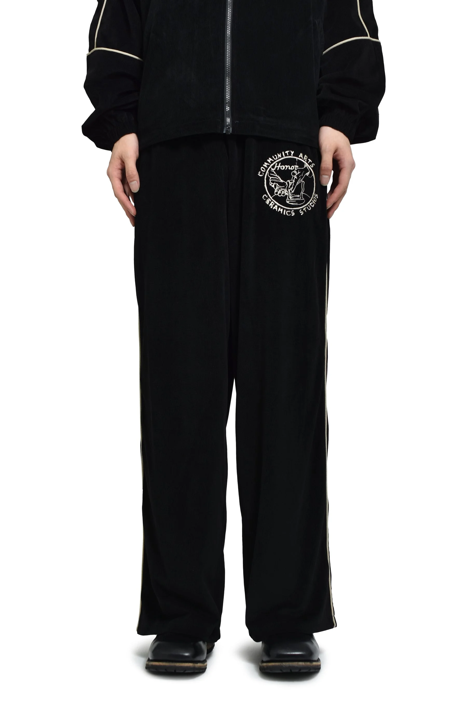 Sizing Size Waist Rise inseam Total length thigh width Hem width M 76cm 29cm 78cm 107cm 34cm 26cm L 80cm 30cm 78cm 108cm 35cm 28cm XL 88cm 30cm 79cm 109cm 36cm 29cm Product Detail - Gender: MEN - Designer: HONOR THE GIFT - Categories: TRACK PANTS HONOR THE GIFT Track pants - Material: 100% polyester - Model Number: htg250310-blk