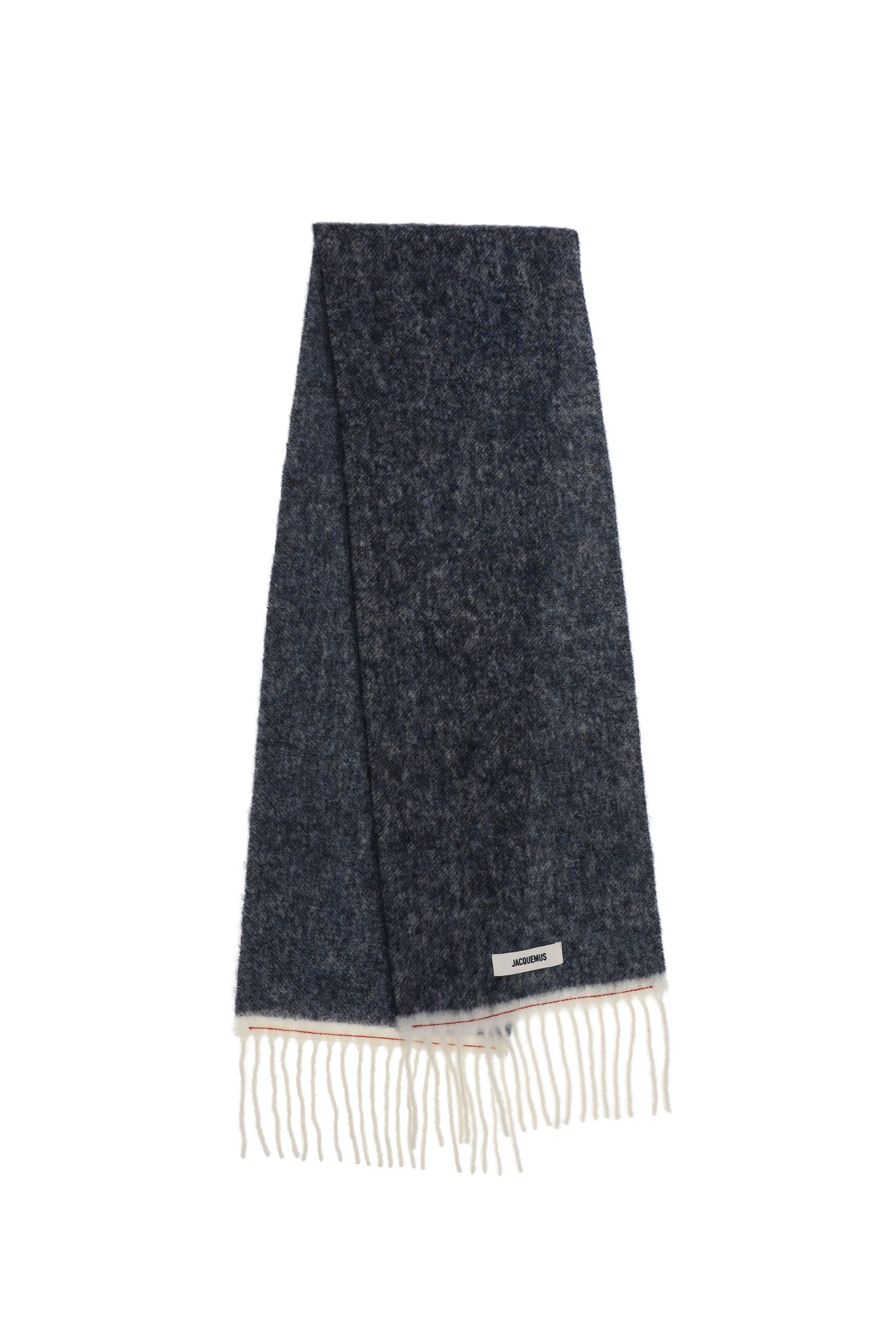 Sizing Size vertical beside OS 39cm 278.5cm Product Detail - Gender: UNISEX - Designer: JACQUEMUS - Categories: SCARVES - Material: MOHAIR 28%, ALPACA 28%, WOOL 24%, POLYAMIDE 20% - Model Number: 24hacu00572bot4032-nvy-white-stripe