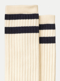 Comfy sport socks. The stripes may vary, but the cotton is always organic. Details - Organic cotton - Semi fine knit - Jacquard logo on the sole - Leg height 27 cm - One size (EU 41-45) 75% Cotton 23% Polyamid 2% Elastane Made in PT Sneak in some sport in your life with these smart, striped socks made with organic cotton. The Nudie Jeans Co logo on the sole.