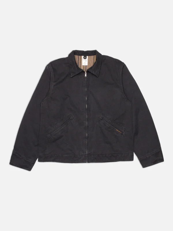 Details - Organic cotton - 11 oz. Rigid duck canvas - Matching thread at seams - Antique silver trims - Regular fit The Blake jacket features a regular fit with a short, boxy silhouette, staying true to the essence of a classic worker jacket. Designed for warmth and mobility, the body is lined with a wool-mix blanket, while the sleeves are lined with a blend of organic cotton and recycled polyamide for ease of movement. Detailed with tonal stitching and curved welt pocket stitching, this jacket masterfully blends vintage inspiration with practical functionality. Curious about the "Duck Canvas"? Let us explain. This fabric is meticulously constructed using irregular ring-spun yarns twisted into durable 2-ply threads, then yarn-dyed through a patented process to ensure it ages beautifully, much like its historical counterpart. The tightly woven dyed yarns create a firm, highly textural canvas that celebrates its imperfections, showcasing a unique crispness and depth. Perfectly suited for workwear, this robust fabric promises durability and a graceful aging journey, growing richer in character over time.