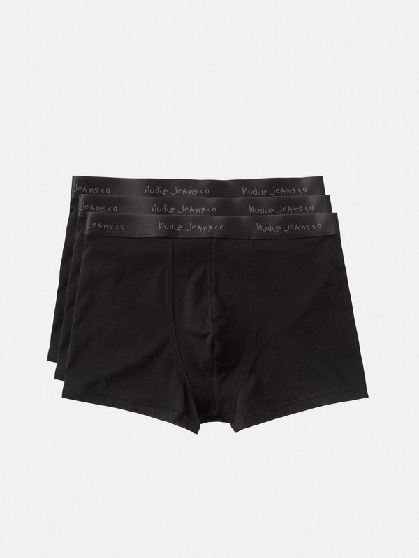 3-pack with our regular-fit boxer briefs made in organic and Fairtrade cotton. Details - Organic and Fairtrade cotton - 3-pack - Part of Nudie Jeans Essentials - Delivered in recycled cotton cardboard box - Regular fit 92% Cotton 8% Elastane Made in IN Wear Nudie from layer one with underwear made in soft jersey that is both organic and Fairtrade. This garment is part of the Nudie Jeans Essentials. The fit is an updated version of our boxer brief. It's slightly bigger with a bit longer legs and a more shaped center front seam. Instead of labels, it has a print on the inside. The Essential styles are delivered in beautiful cardboard boxes made with recycled cotton. When you buy Nudie Jeans underwear, you can be sure that we have paid our share of living wages for it.