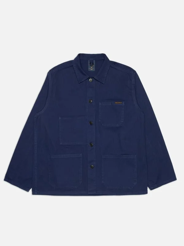 Details - Organic cotton - Rigid herringbone twill - Matching thread at seams - Corozo buttons - Regular fit This regular-fit chore jacket offers a neat and spacious design, featuring one chest pocket, one roomy inside pocket, and two front pockets. The pockets are securely attached with single stitches that form small triangles at the pocket openings, reinforcing both functionality and aesthetics. The main seams are sewn with felled twin-needle seams, providing a clean and sturdy construction. From its silhouette to its making, Buddy is our love for simplistic workwear jackets condensed into one, simple and beautiful, jacket. This particular Buddy jacket is crafted from exquisite herringbone twill fabric. Its tightly woven construction gives it a slightly crisp texture, a dry feel, and a smooth appearance. The pattern of the fabric pays homage to vintage herringbone twills, and to ensure longevity and desirable aging properties, we have piece-dyed it in a perfect deep blue shade. The jacket has undergone a gentle wash, subtly accentuating the fabric's characteristics and garment construction. Curious to learn more about herringbone twill? We're delighted you asked! Herringbone twill is a variation of the regular twill weaving pattern. While regular twill, as seen in denim, exhibits a distinct diagonal pattern, herringbone twill features broken diagonal lines, creating a noticeable zig-zag pattern (more prominent than in a broken twill). The zig-zag pattern, resembling the bone structure of a herring, is compact yet distinctive. Herringbone twill is commonly found in vintage workwear jackets, particularly those of French and German origin, often in blue or grey hues. Moreover, it is well-known for its usage in vintage military garments, commonly referred to by its acronym HBT. The choice of herringbone twill in workwear and military garments can, to our knowledge, be attributed to two primary reasons. Firstly, the alteration of the twill direction enhances tear resistance. Secondly, during a time when sanforization and skewing processes were not yet developed, herringbone twill exhibited a reduced tendency to skew compared to regular twill. This aspect, similar to the purpose behind the development of broken twill, contributed to its popularity. There you have it, the ins and outs of herringbone twill.
