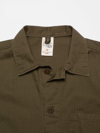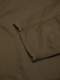 Our regular-fit jacket Buddy crafted from exquisite herringbone twill fabric. Size & Fit Model is wearing size: M Model's height: 186 cm / 6’1” Details - Organic cotton - Rigid 7.8 oz. herringbone twill - Matching thread at seams - Olive Corozo buttons - Regular fit 100% Cotton Made in TN This regular-fit chore jacket offers a neat and spacious design, featuring one chest pocket, one roomy inside pocket, and two front pockets. The pockets are securely attached with single stitches that form small triangles at the pocket openings, reinforcing both functionality and aesthetics. The main seams are sewn with felled twin-needle seams, providing a clean and sturdy construction. From its silhouette to its making Buddy is our love for simplistic workwear jackets condensed into one, simple and beautiful, jacket. This particular Buddy jacket is crafted from exquisite herringbone twill fabric. Its tightly woven construction gives it a slightly crisp texture, a dry feel, and a smooth appearance. The pattern of the fabric pays homage to vintage herringbone twills, and to ensure longevity and desirable aging property, we have piece-dyed it in a perfect Olive shade. The jacket has undergone a gentle wash, subtly accentuating the fabric's characteristics and garment construction. Curious to learn more about herringbone twill? We're delighted you asked! Herringbone twill is a variation of the regular twill weaving pattern. While regular twill, as seen in denim, exhibits a distinct diagonal pattern, herringbone twill features broken diagonal lines, creating a noticeable zig-zag pattern (more prominent than in a broken twill). The zig-zag pattern, resembling the bone structure of a herring, is compact yet distinctive. Herringbone twill is commonly found in vintage workwear jackets, particularly those of French and German origin, often in blue or grey hues. Moreover, it is well-known for its usage in vintage military fatigues, commonly referred to by its acronym HBT. The choice of herringbone twill in workwear and military garments can, to our knowledge, be attributed to two primary reasons. Firstly, the alteration of the twill direction enhances tear resistance. Secondly, during a time when sanforization and skewing processes were not yet developed, herringbone twill exhibited a reduced tendency to skew compared to regular twill. This aspect, similar to the purpose behind the development of broken twill, contributed to its popularity. There you have it, the ins and outs of herringbone twill.