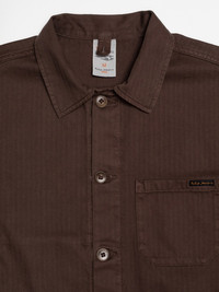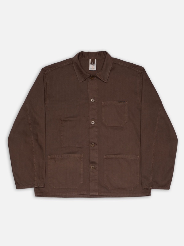Regular-fit chore jacket with a neat, spacious design featuring one chest pocket, one inside pocket, and two front pockets. Crafted from herringbone twill fabric in a Walnut shade, with a gently washed finish to enhance its texture. Made from organic cotton. Details - Organic cotton - 7.8 oz. rigid herringbone twill - Matching thread at all seams - Corozo buttons - Regular fit 100% Cotton Made in TN This regular-fit chore jacket offers a neat and spacious design, featuring one chest pocket, one roomy inside pocket, and two front pockets. The pockets are securely attached with single stitches that form small triangles at the pocket openings, reinforcing both functionality and aesthetics. The main seams are sewn with felled twin-needle seams, providing a clean and sturdy construction. From its silhouette to its making Buddy is our love for simplistic workwear jackets condensed into one, simple and beautiful, jacket. This particular Buddy jacket is crafted from exquisite herringbone twill fabric. Its tightly woven construction gives it a slightly crisp texture, a dry feel, and a smooth appearance. The pattern of the fabric pays homage to vintage herringbone twills, and to ensure longevity and desirable aging property, we have piece-dyed it in a perfect Walnut shade. The jacket has undergone a gentle wash, subtly accentuating the fabric's characteristics and garment construction. Curious to learn more about herringbone twill? We're delighted you asked! Herringbone twill is a variation of the regular twill weaving pattern. While regular twill, as seen in denim, exhibits a distinct diagonal pattern, herringbone twill features broken diagonal lines, creating a noticeable zig-zag pattern (more prominent than in a broken twill). The zig-zag pattern, resembling the bone structure of a herring, is compact yet distinctive. Herringbone twill is commonly found in vintage workwear jackets, particularly those of French and German origin, often in blue or grey hues. Moreover, it is well-known for its usage in vintage military fatigues, commonly referred to by its acronym HBT. The choice of herringbone twill in workwear and military garments can, to our knowledge, be attributed to two primary reasons. Firstly, the alteration of the twill direction enhances tear resistance. Secondly, during a time when sanforization and skewing processes were not yet developed, herringbone twill exhibited a reduced tendency to skew compared to regular twill. This aspect, similar to the purpose behind the development of broken twill, contributed to its popularity. There you have it, the ins and outs of herringbone twill.