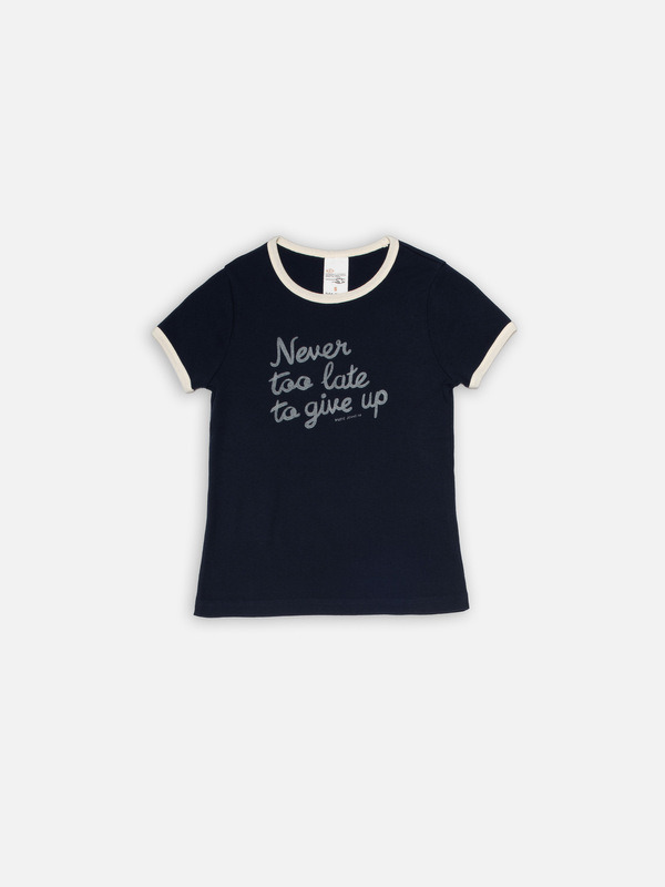 Fitted crew neck t-shirt with cap sleeve made a light 1x1 rib knit with a dry hand. The neck and sleeve openings are finished with an offwhite binding in shell fabric. The cotton used is organic, of course. Print on the chest. Details - Organic cotton - Cap sleeve - 1x1 rib knit - Contrast bindings - Print on the chest - Slim fit 100% Cotton Made in PT Fitted crew neck t-shirt with cap sleeve made a light 1x1 rib knit with a dry hand. The neck and sleeve openings are finished with an offwhite binding in shell fabric. The cotton used is organic, of course. Print on the chest.