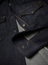 George, our regular fit shirt crafted from the extraordinary Dry Ace Selvage. Made from organic cotton. Size & Fit Model is wearing size: M Model's height: 189 cm / 6’2” Details - Organic cotton - 14.2 oz. Japanese rigid selvage denim - Beige pearl snap button - Tobacco thread allover - Regular fit 100% Cotton Made in TN We are thrilled to introduce our regular fit shirt George in the extraordinary Dry Ace Selvage. This remarkable fabric, weighing 14.2 oz showcases a rustic texture and a deep, redcast indigo hue, is a true masterpiece. Crafted by the renowned Shinya Mills in Okayama, Japan, it exemplifies the art of perfecting selvage denim imperfections. The story behind Dry Ace Selvage is as fascinating as the fabric itself. It all began with a vintage, unbranded pair of jeans believed to date back to the 1950s, discovered in a thrift store somewhere in the USA. These jeans displayed wear and significant fading, and most importantly an incredible texture. They made their way to Japan, where denim from the jeans was meticulously reverse-engineered in exhaustive detail. The art of reverse engineering denim is a hallmark of the artisanal Japanese denim industry. Dry Ace Selvage is a remarkable example of this craft, as well as a testament to the unique collaborative approach sometimes employed for premium Japanese denim. The rather extreme slub yarns are spun by Yamachu Mengyo Co. Ltd. in Osaka. The warp yarns undergo an impressive 20 dips in pure indigo dye, resulting in a deeply saturated surface with a notably substantial undyed core, courtesy of Kaihara Co. Ltd. in Hiroshima. Finally, the fabric is masterfully woven under low tension on vintage shuttle looms by Shinya Mills in Okayama. The guiding principle here is - do what you do best - and the final product beautifully reflects the craftsmanship at each stage of the denim's creation. Ace's distinctive character arises from its thick and highly irregular yarns, generous use of indigo, and low-tension weaving. These factors contribute to its appealingly rugged ageing property. Over time, the dye rapidly abrades from the surface of the yarns, emphasizing their slub, particularly in the vertical direction. When, or if, the jeans are washed, the yarns slightly rearrange, reducing the vertical slub and transitioning to a rustic crosshatch texture with a coarse salt 'n pepper effect. Notably, the heavily saturated surface of the indigo yarns entails an extraordinary evolution. Washing initially causes the dye to bleed onto the white weft, increasing the depth of color. With successive washes, the indigo gradually fades into brighter brilliant blue hues while deeper tones are preserved at seams and folds. Due to its unparalleled ageing property, Ace unquestionably stands as one of the finest Japanese selvage denims we have ever encountered. We are therefore very proud to offer it in George.