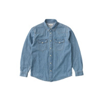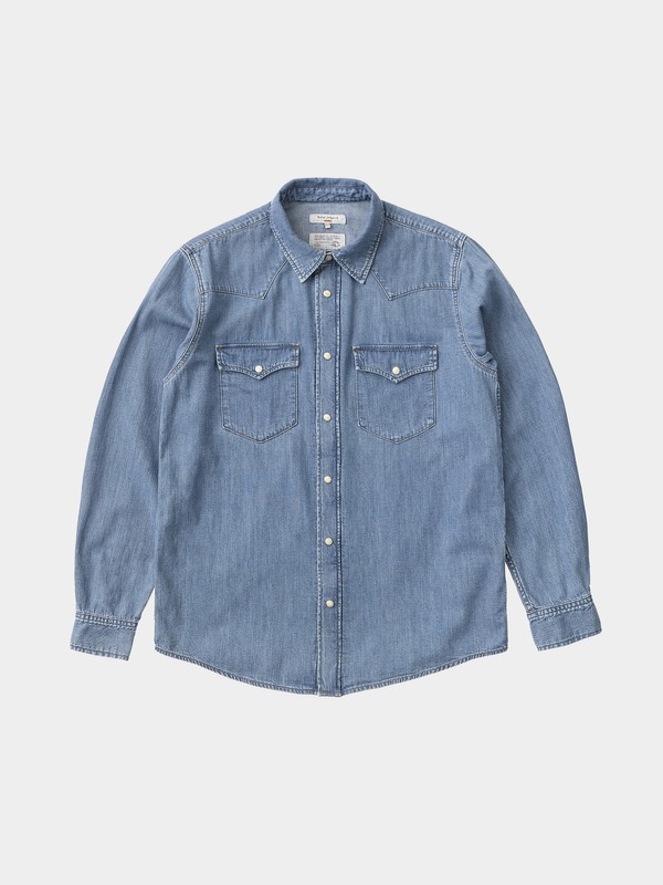 Regular fit denim shirt with evident western vibes, well-worn with a uniform blue tone. Made with organic cotton. Size & Fit Model is wearing size: M Model's height: 187 cm / 6`1.5" Details - Organic cotton - 7.8 oz. rigid denim - Beige pearl snap button - Tobacco thread allover - Regular fit 100% Cotton Made in TN A regular fit shirt with an evident western-inspired look. Front yoke and single-point patch pockets with flap pockets that close with mother of pearl snap buttons. George has a clean look, ripe with the authenticity we love about vintage denim shirts: well-worn with a uniform light blue tone.