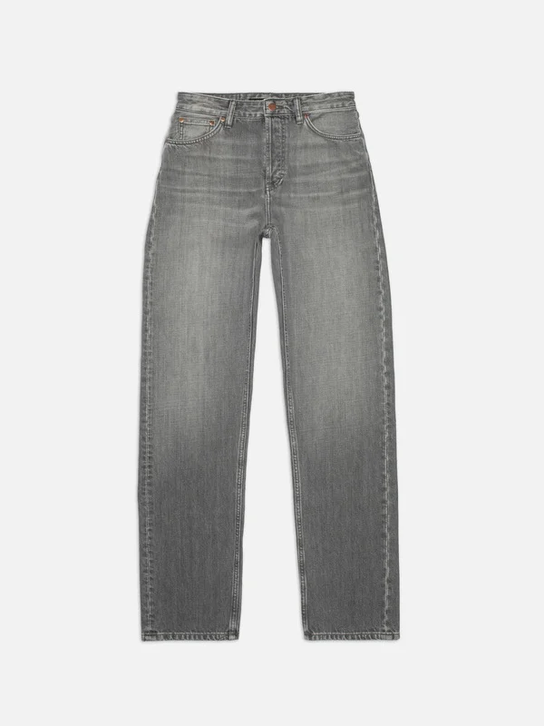 Details - Organic cotton - 13 oz. rigid denim - Grey thread at seams - Copper trims - Button fly - Jacron patch - Regular fit - High waist - Straight leg - Regular leg opening High-waist, regular-fit jeans with a straight leg, crafted in the monochrome Foggy Grey wash. Light in tone yet rich in depth, this wash blends soft, pale greys with charcoal undertones. The streaky warp texture, paired with a subtle crosshatch effect, enhances the fabric’s natural character, while abrasions create highlights that add dimension. A washed-out light grey wash—understated, textured, and full of muted details.