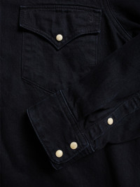 Regular-fit western-style black denim shirt featuring ornamented metal tips and beige pearl buttons. Made from organic cotton. Size & Fit Model is wearing size: S Model's height: 177 cm / 5’9” Details - Organic cotton - 10 oz. midweight rigid denim - Beige pearl buttons - Ornamented metal colar tips - Regular fit 100% Cotton Made in TN Lotta is a regular-fit denim shirt designed with a Western-inspired style. It is made from exquisite midweight denim, featuring clean twill lines and subtle marbling wash effects. A set of ornamented metal tips and the beige pearl buttons add finesse and create a striking contrast against the dull black denim.
