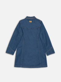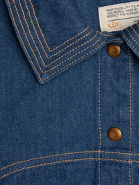 Introducing Maj, our interpretation of the western-style dress—featuring pointy front and back yokes, two neatly placed front pockets, and adorned with copper snap buttons, it effortlessly blends ranch wear with '70s denim aesthetics. Crafted from muted light blue indigo-dyed denim, it pays homage to the playful denim styles of the '70s. Constructed with slightly irregular yarns at a fairly high density and treated to a soft garment wash, the dress features a dry, textural hand and a pleasing indigo tone. With wear and washing, it will age, gradually evolving to even brighter blue hues. Details - Organic cotton - 12.5 oz rigid denim - Light Tobacco thread on all seams - Vintage-inspired brass snap buttons - Woven label - Regular fit 100% Cotton Made in TN Introducing Maj, our interpretation of the western-style dress—featuring pointy front and back yokes, two neatly placed front pockets, and adorned with copper snap buttons, it effortlessly blends ranch wear with '70s denim aesthetics. Crafted from muted light blue indigo-dyed denim, it pays homage to the playful denim styles of the '70s. Constructed with slightly irregular yarns at a fairly high density and treated to a soft garment wash, the dress features a dry, textural hand and a pleasing indigo tone. With wear and washing, it will age, gradually evolving to even brighter blue hues.