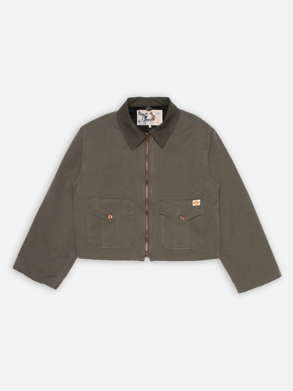 Molly features a short and boxy relaxed fit. Designed for warmth, it is fully lined with a quilted, padded lining throughout the jacket. Crafted from our "Duck Canvas," a pale fir-green 2-ply canvas weave, this jacket is detailed with tonal stitching, a stainless steel zipper, and copper buttons. It features patch-on pockets with double functionality: each pocket has a top flap for traditional use, as well as a vertical opening on the side, providing separate spaces for both small items and somewhere to warm your hands. The collar, crafted from the same Duck Canvas in a deeper green shade, adds a subtle tonal contrast, enhancing its workwear-inspired aesthetic. Details - Organic cotton - 11 oz. Rigid duck canvas - Matching thread at seams - Stainless steel zip - Copper buttons - Relaxed fit 100% Cotton Made in TN Molly features a short and boxy relaxed fit. Designed for warmth, it is fully lined with a quilted, padded lining throughout the jacket. Crafted from our "Duck Canvas," a pale fir-green 2-ply canvas weave, this jacket is detailed with tonal stitching, a stainless steel zipper, and copper buttons. It features patch-on pockets with double functionality: each pocket has a top flap for traditional use, as well as a vertical opening on the side, providing separate spaces for both small items and somewhere to warm your hands. The collar, crafted from the same Duck Canvas in a deeper green shade, adds a subtle tonal contrast, enhancing its workwear-inspired aesthetic. The result is a thoughtfully designed piece that blends mid-20th-century vintage hunting gear inspiration with classic workwear appeal. Curious about the "Duck Canvas"? Let us explain. This fabric is meticulously constructed using irregular ring-spun yarns twisted into durable 2-ply threads, then yarn-dyed through a patented process to ensure it ages beautifully, much like its historical counterpart. The tightly woven dyed yarns create a firm, highly textural canvas that celebrates its imperfections, showcasing a unique crispness and depth. Perfectly suited for workwear, this robust fabric promises durability and a graceful aging journey, growing richer in character over time.