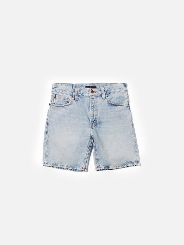 Regular-fit shorts with a high waist and a wide leg in a rich, marbled textured, worn-in stonewash. Size & Fit Model is wearing size: W30" Model's height: 186 cm / 6’1” Details - Organic cotton - 14.9 oz. rigid denim - Tobacco thread at seams - Stainless metal trims - Button fly - Regular fit - High waist - Wide leg 100% Cotton Made in TN Regular-fit shorts with a high waist and a wide leg in a rich, marbled textured, worn-in stonewash. The denim's distinctive texture adds depth and intricate detailing to the brilliant blue hue, creating a dynamic interplay of bright indigo shades and rich textural details. The rustic marble texture contrasts the smooth abraded areas, elevating the overall textural richness. Subtle local tints grace the areas with abrasions, infusing a warm authenticity that harmonizes with the vibrant blue tones. Tobacco thread and indigo embroidery add a subtle contrast, allowing the denim to rightfully claim the spotlight it deserves.