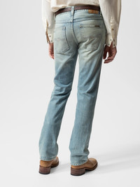 Our classic fit Slim Jim is back in a limited edition. Slim Jim jeans in Summer Dirt wash with textural slubs. Made from 13.7 oz rigid organic cotton denim. Features off-white stitching, slim fit, and slight bootcut. Details - Organic cotton - 13.7 oz. rigid denim - Off white thread at seams - Copper trims - Zip fly - Jacron patch - Slim fit - Mid waist - Slim leg - Slight bootcut 100% Cotton Made in TN The Nudie Jeans classic, Slim Jim—a slim fit jean with a slight bootcut is back. The Summer Dirt wash, crafted from streaky denim, features a striking texture with pronounced vertical slubs of varying length and thickness. This slubby texture is beautifully complemented by a subtle crosshatch pattern, adding depth and dimension to the denim's rich surface. The expertly crafted wash enhances these textures, bringing out the lows for added depth, while the warmly tinted highlights add brightness and a smoother, more vertically streaked appearance. The sun-bleached, dulled tone amplifies the vintage vibe, and the off-white thread color pays homage to one of the earliest Slim Jim styles. Slim Jim Summer Dirt is our vivid past brought back to life.