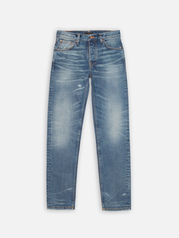 Regular-fit jeans with tapered leg in mid-blue wash with contrasting wear marks. Crafted from rigid organic cotton denim with orange thread details. Details - Organic cotton - 13.3 rigid denim - Orange thread at seams - Copper trims - Button fly - Jacron patch - Regular fit - Mid waist - Tapered leg - Slim leg opening 100% Cotton Made in TN Regular-fit jeans with a tapered leg, washed to a mid-blue tone with strikingly contrasting wear marks. Crafted from exceptional denim, these jeans showcase a rich ring-spun texture, with pronounced slubs in both the warp and weft, creating a rustic crosshatch pattern and subtle marbling effects. The expertly applied wash amplifies the fabric’s unique texture, enhancing its balanced irregularities while delivering a beautifully worn-in look with bold contrasts.